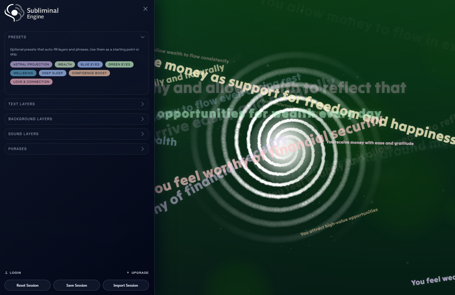 Subliminal Engine is built around that principle. It allows you to create immersive, layered sessions where your intentions can be presented in a way that slips past mental chatter and reaches deeper levels of mind.